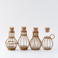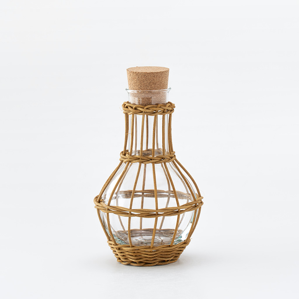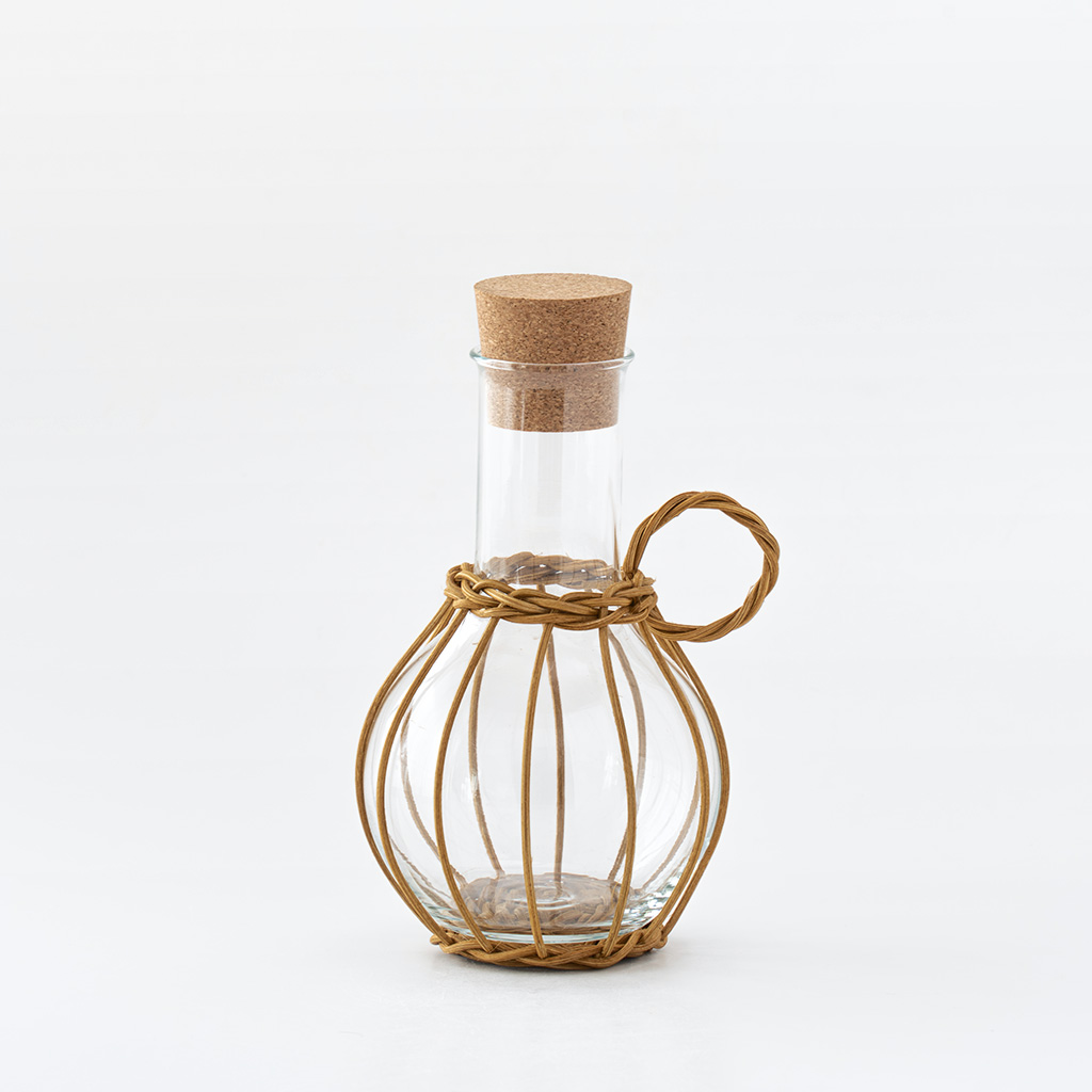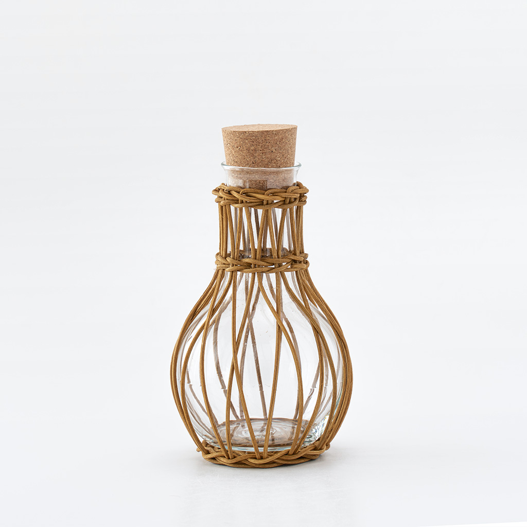ガラス瓶をラタンで包むように編み上げたフラワーベース。