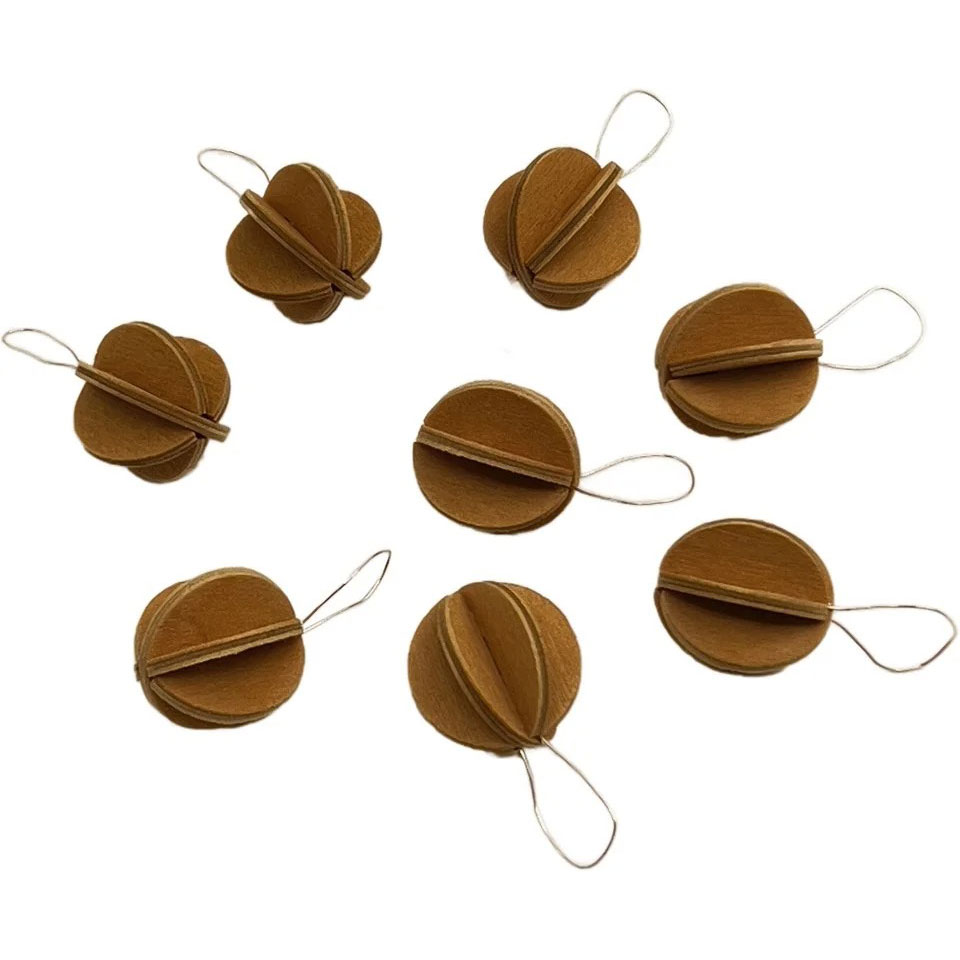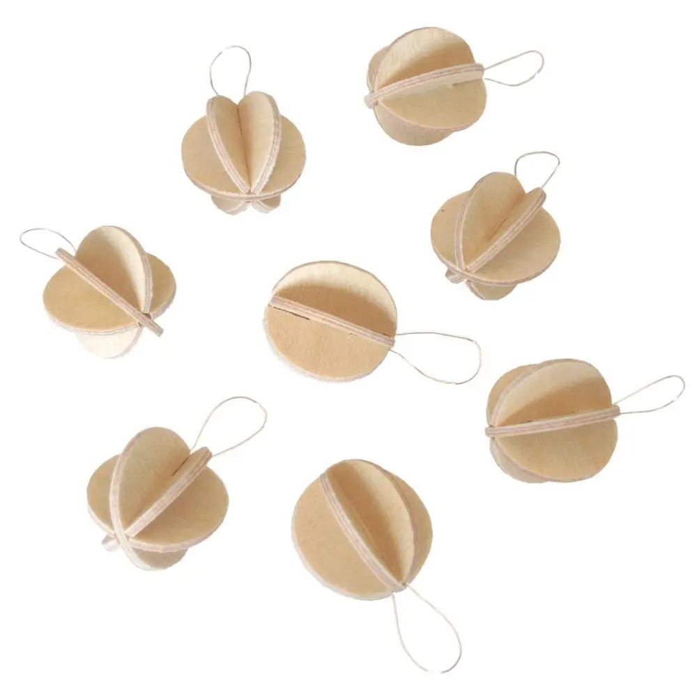 組み立てる前は、木製のグリーティングカードになっています。切り込みに沿ってパーツを切り離し組み立てると、立体的なミニボールのオーナメントができあがります。1枚のカードから8つのミニボールが作れますよ。